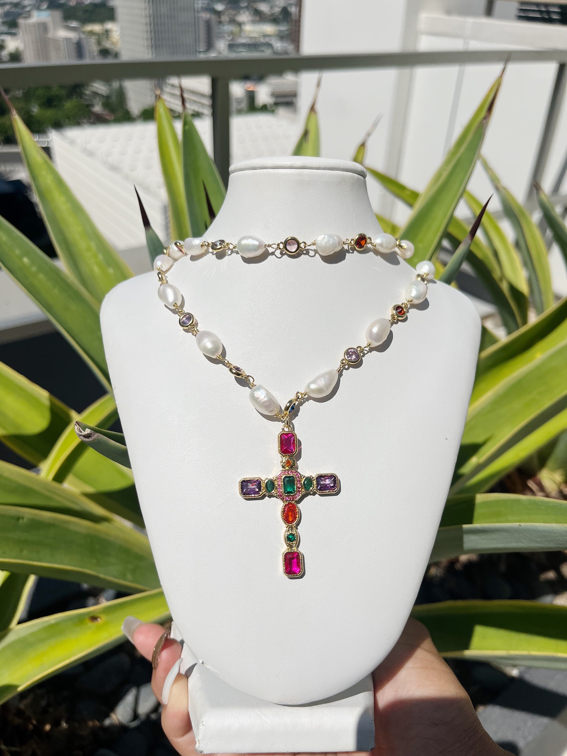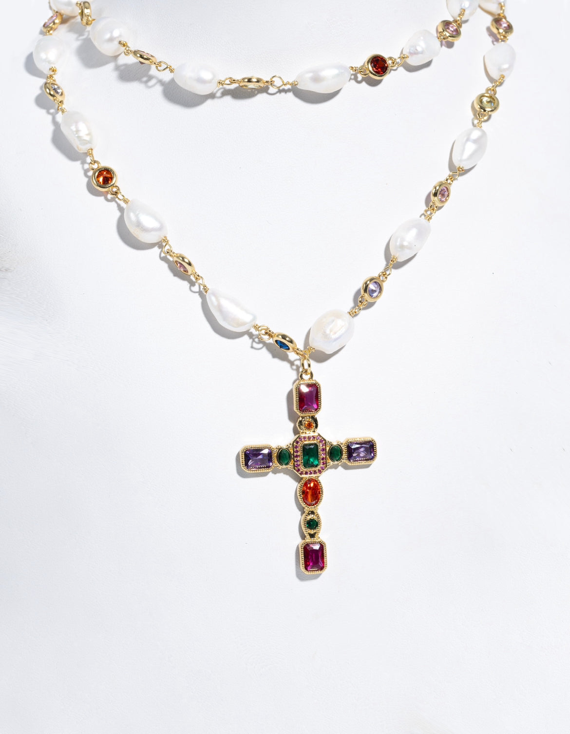 Introducing our exquisite Freshwater Pearl Layered Necklace with a Multi-Colored Gold-Plated Cross – a true embodiment of timeless elegance and contemporary style.